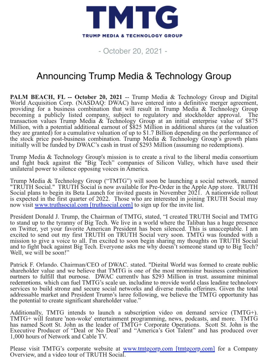 Trump Media and Technology Group, former president Donald Trump’s company, announced on Wednesday the launch of a new social network named TRUTH Social. A beta version will be available to invited guests in November and a nationwide rollout is expected in the first quarter of 2022, according to a press release. The company says its mission is to "create a rival to the liberal media consortium and fight back against the 'Big Tech' companies of Silicon Valley."